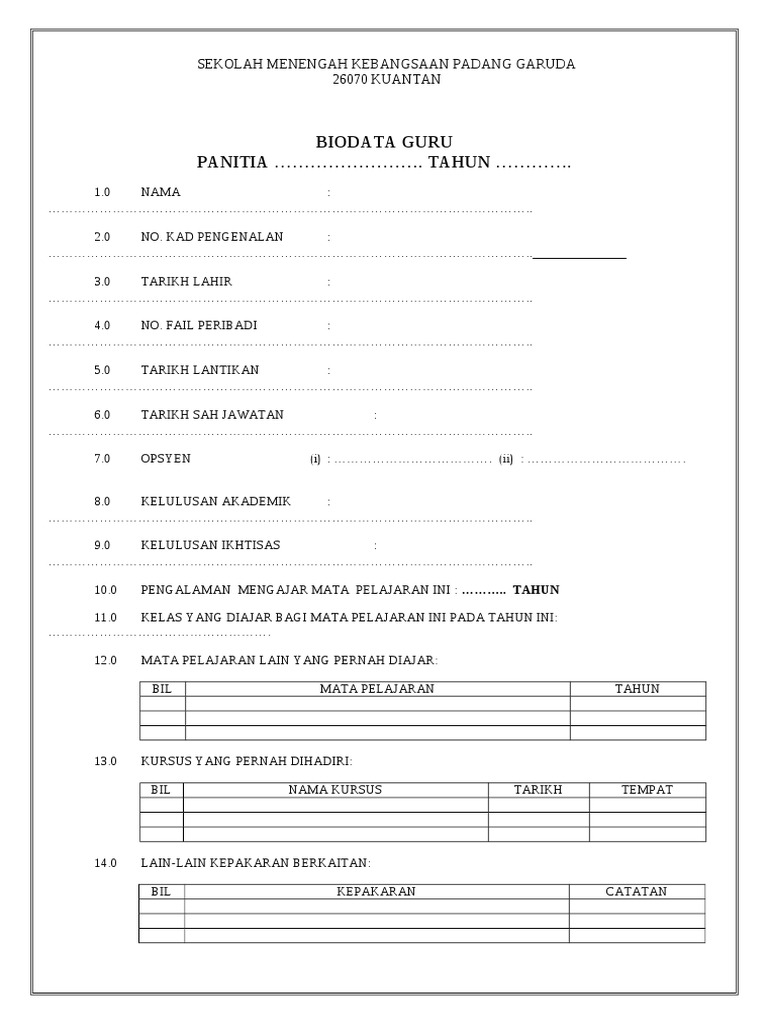 . Terima kasih di atas kerjasama semua. Borang Biodata Guru Untuk Fail Panitia. Search inside document.